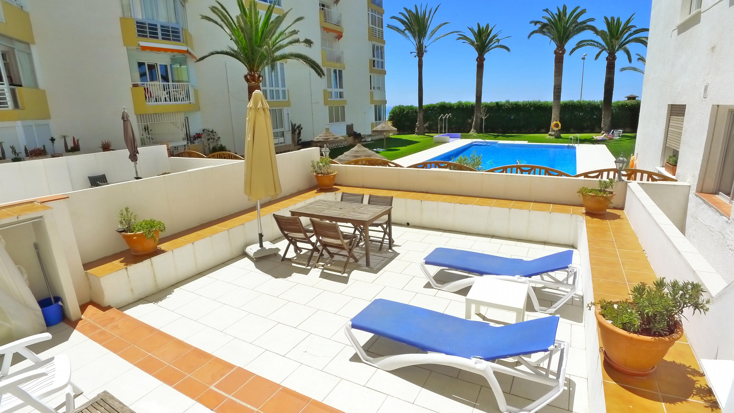 Tiene una gran terraza privada orientada al sur, bien equipada con vistas a la piscina y a los jardines, ideal para tomar el sol y cenar al aire libre.