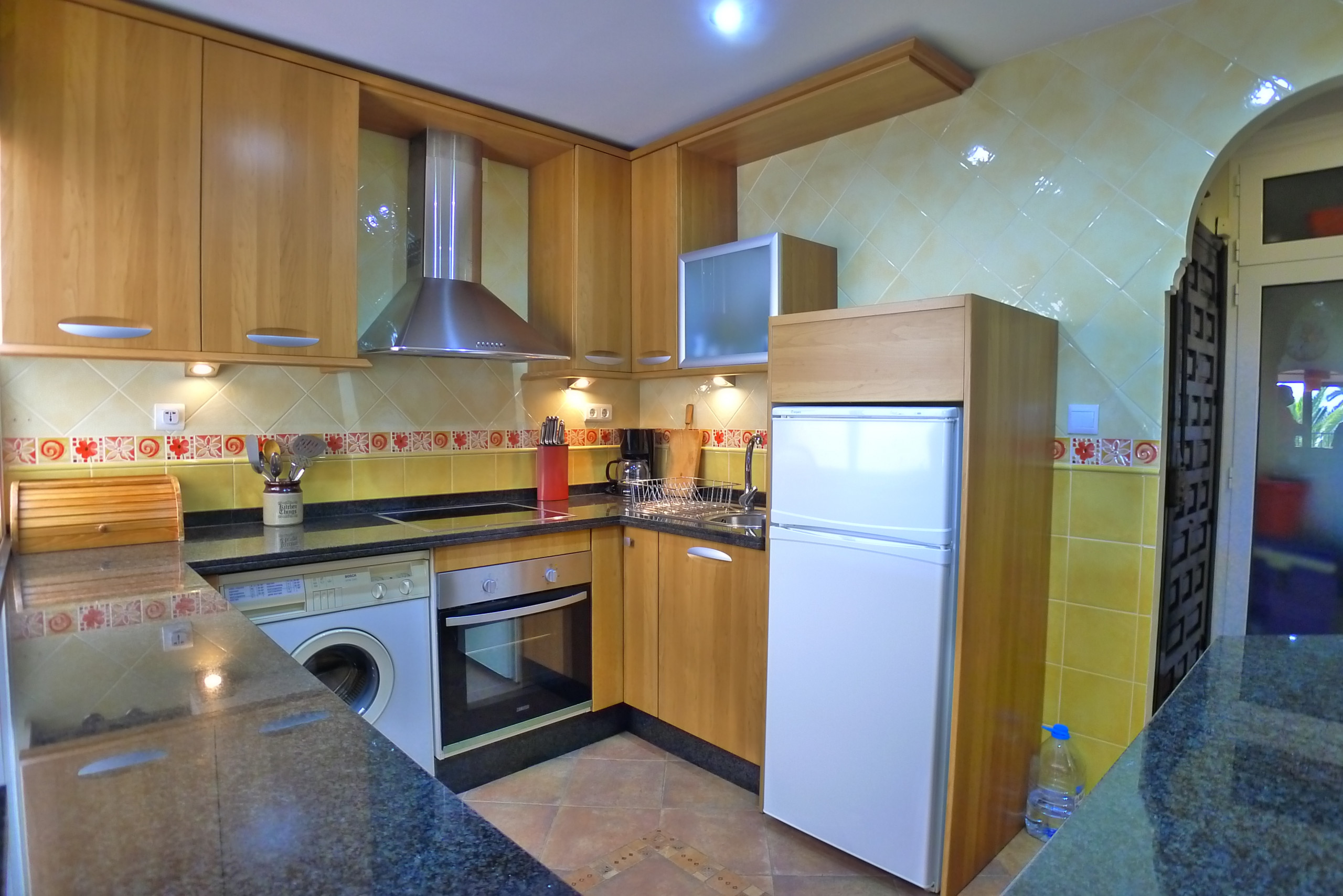 La cocina bien equipada con horno, microondas, vitrocerámica, nevera y lavadora.