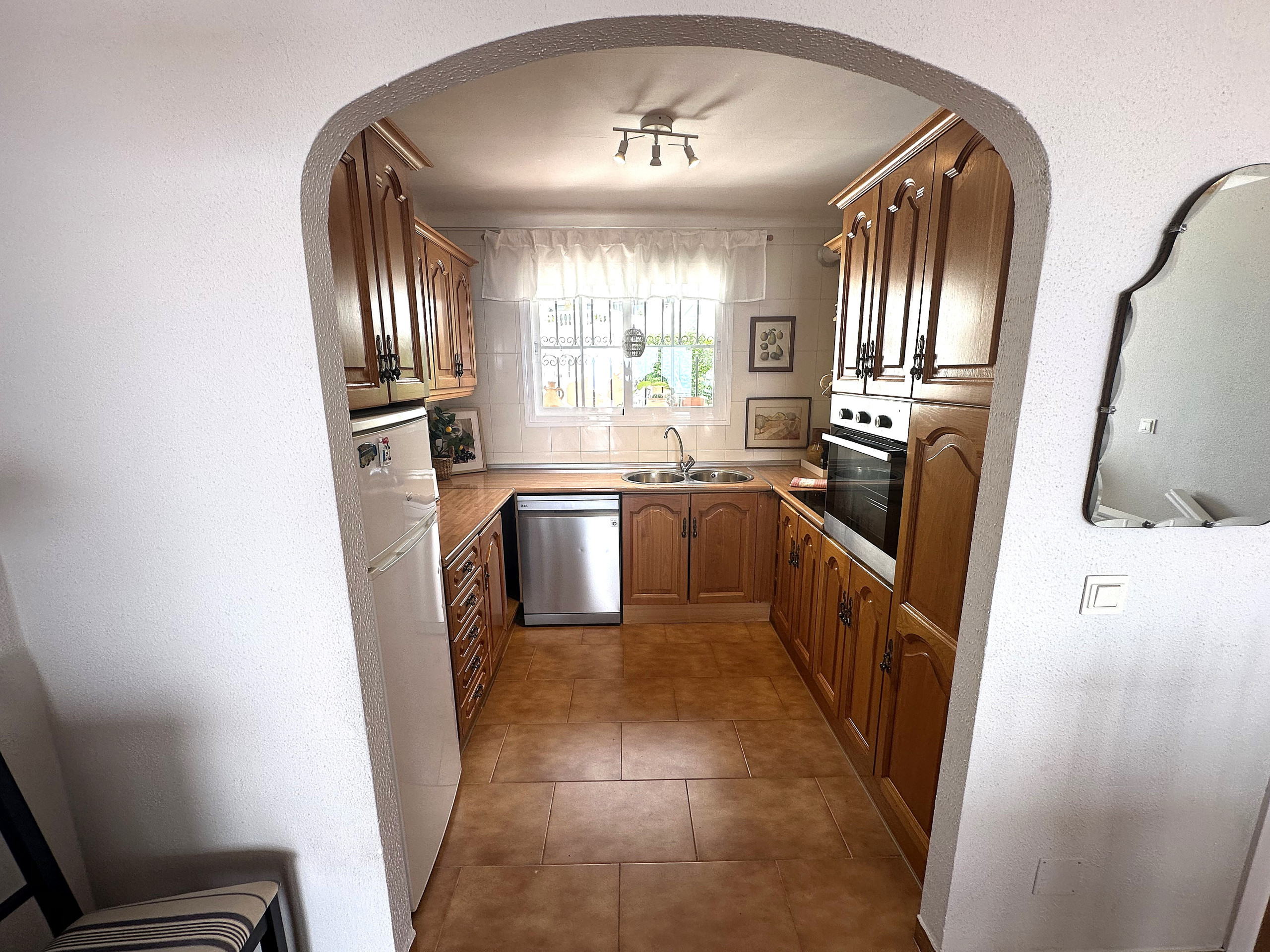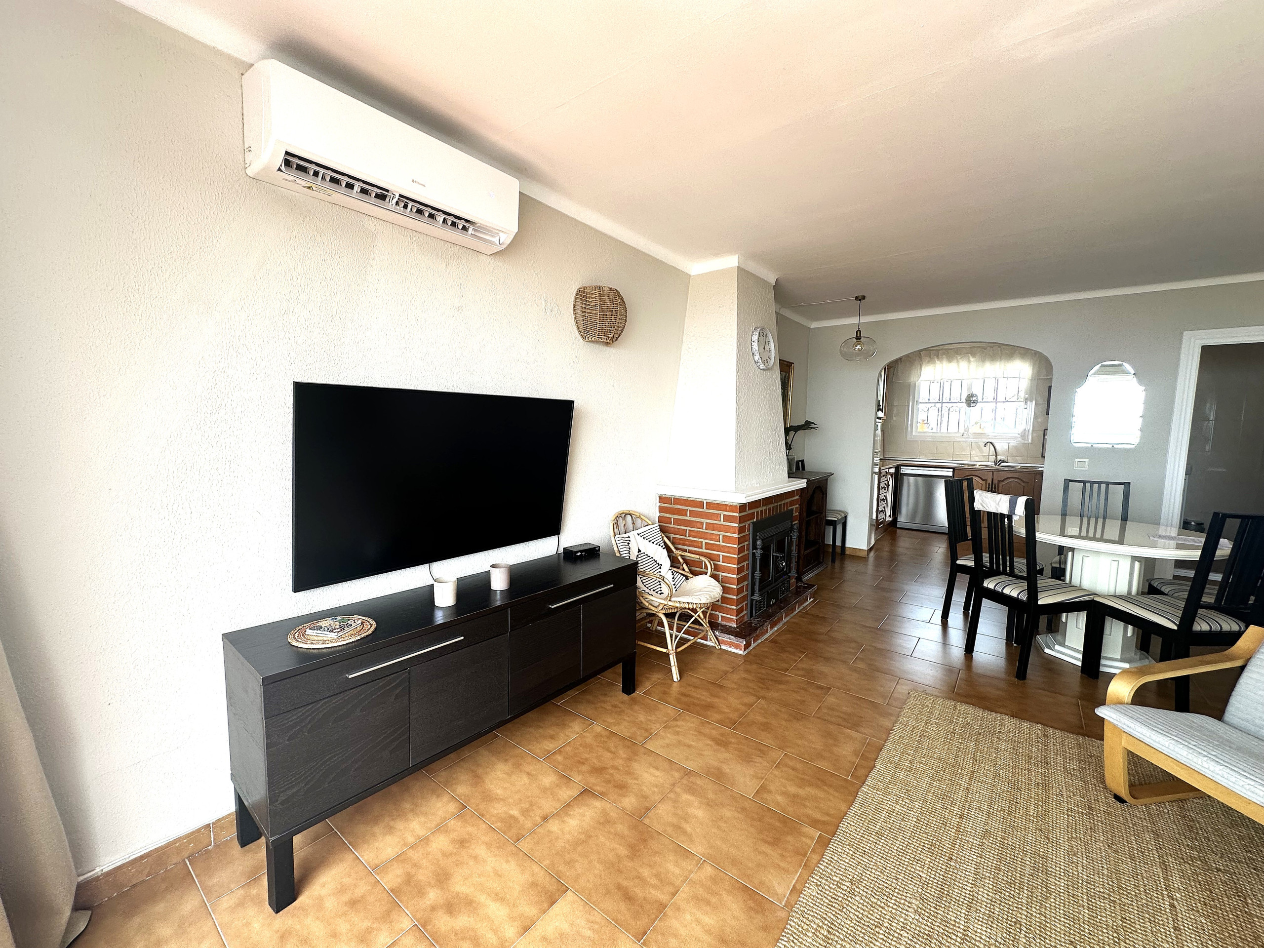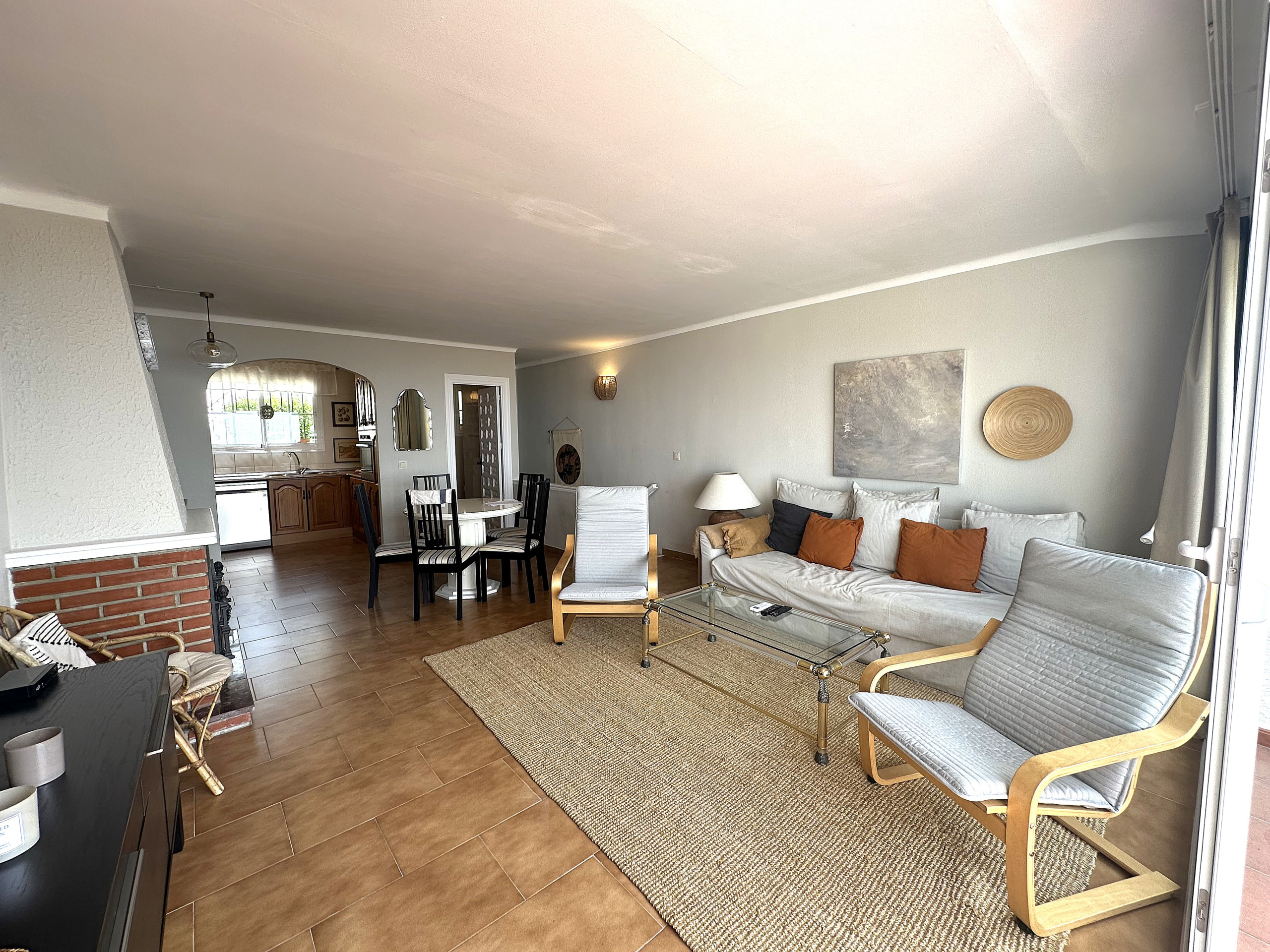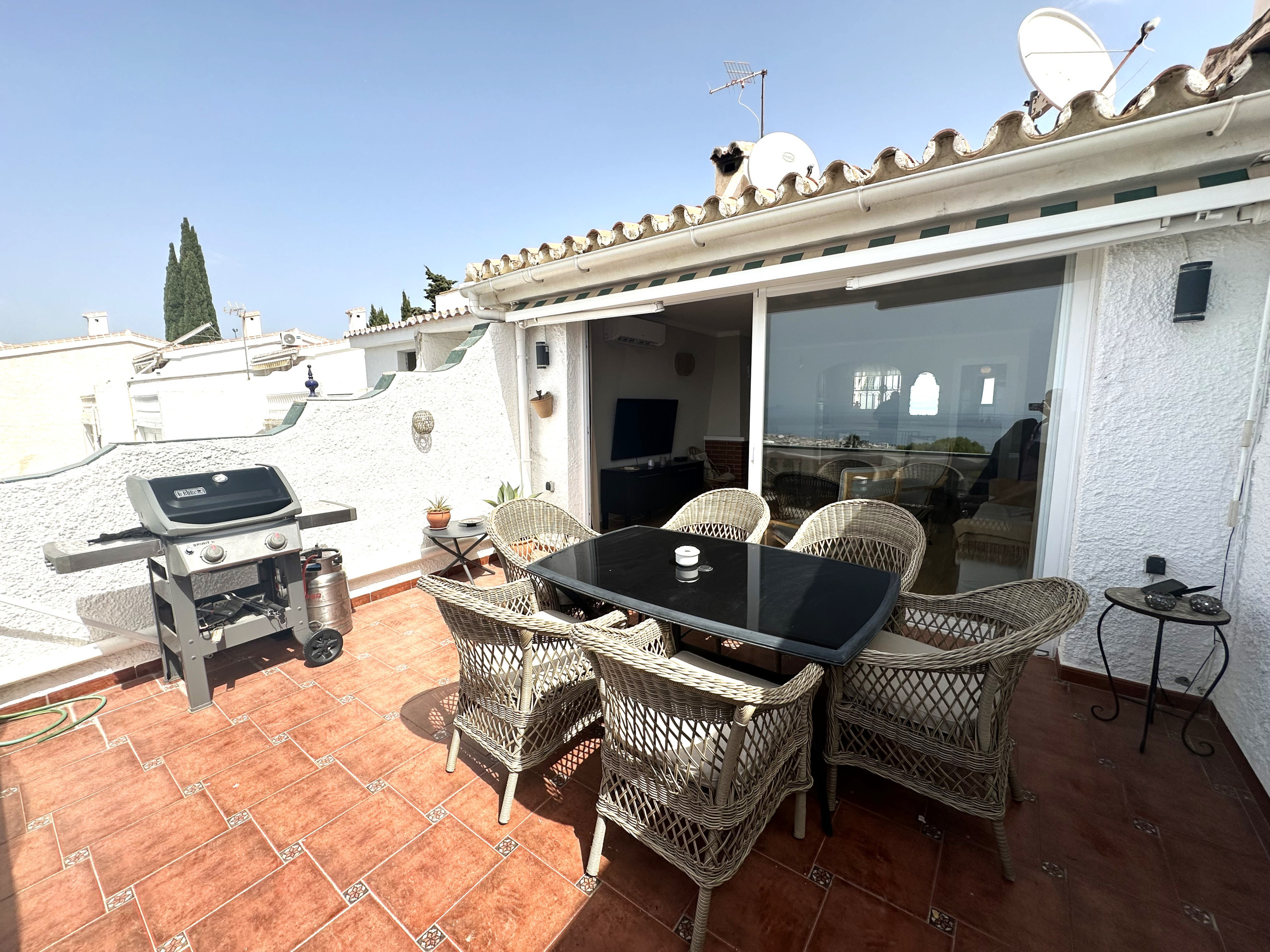 La propiedad está dividida en dos plantas, en la planta baja cuenta con 3 dormitorios y con un baño completo con ducha. Uno de los dormitorios comunica a través del acceso de otro dormitorio. En la planta superior, dispone de un amplio salón-comedor con cocina americana y aseo, desde el salón se accede a una terraza con una mesa y sillas, dispone de una buena barbacoa para disfrutar grandes momentos. Desde la terraza hay unas espectaculares vistas del mar, de toda Nerja y de las montañas.